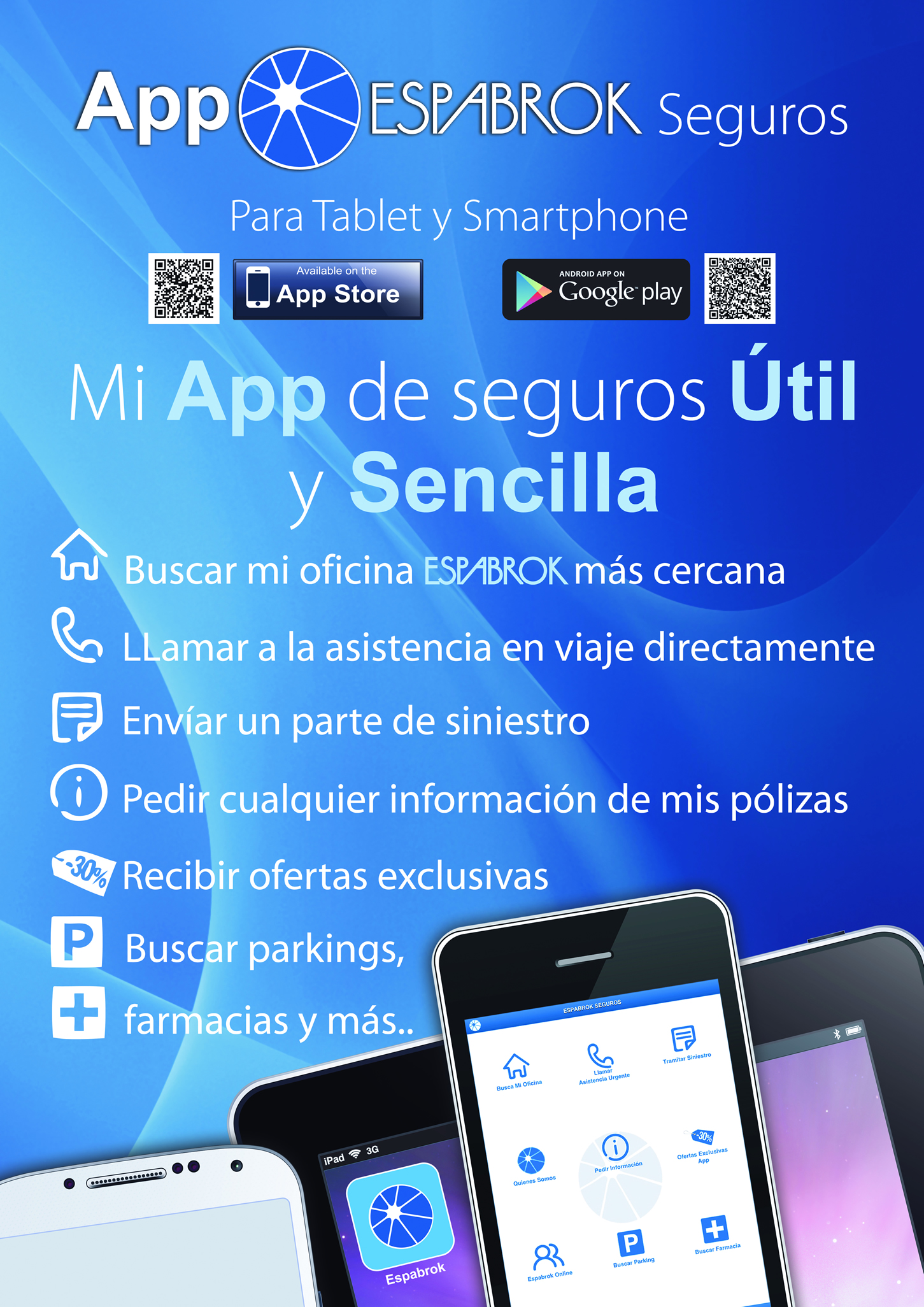 Ahora, siempre que nos necesites, estaremos contigo gracias a nuestra aplicación móvil de Espabrok Seguros. Una App de móvil que te ayudará a buscar tu oficina más cercana, llamar a asistencia en viaje, enviar un parte de siniestro, pedir información de pólizas y recibir ofertas exclusivas por ser cliente de Espabrok Seguros.
